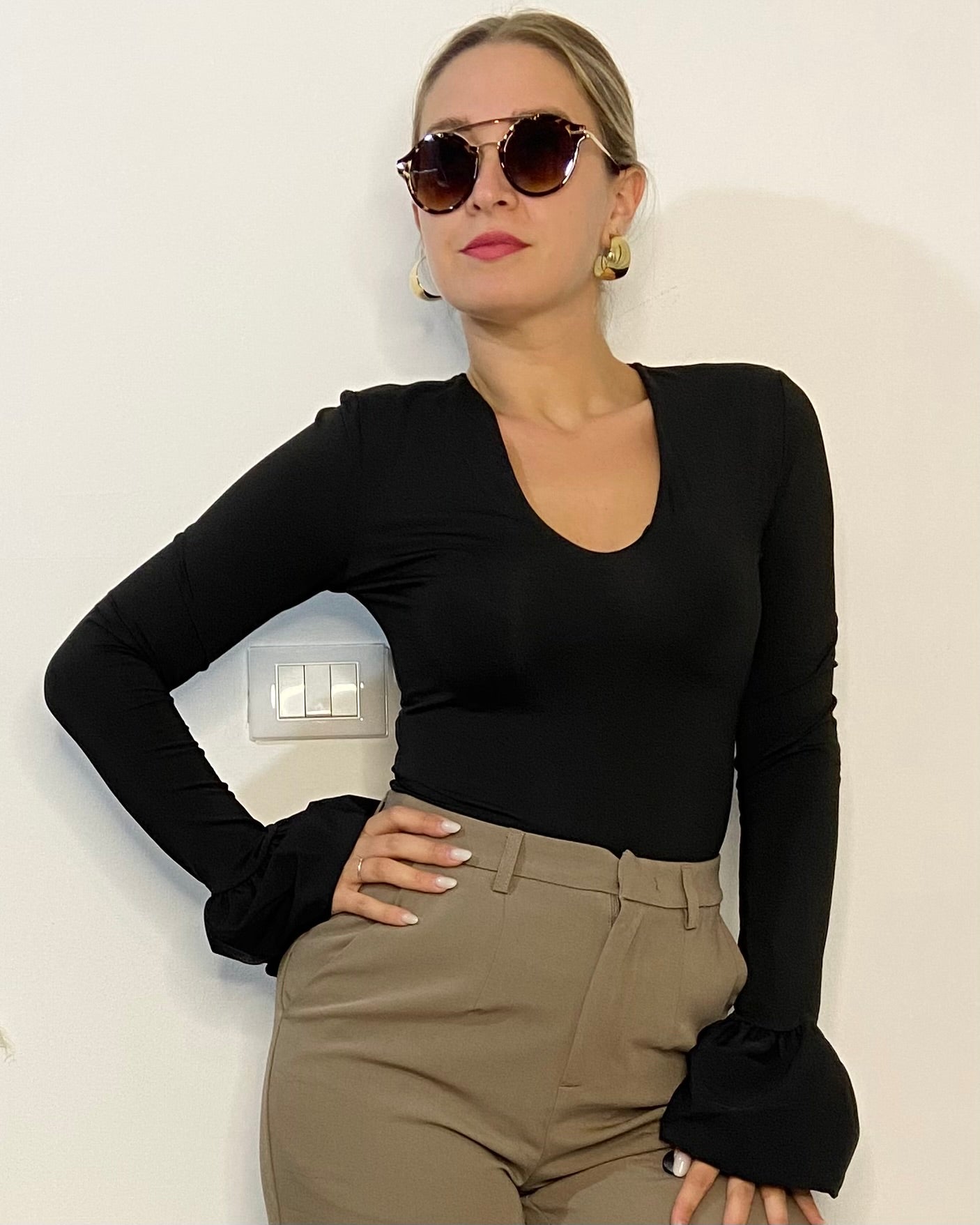 Body dal fondo manica con voulant e scollatura a V. Taglia unica vestibilitá da una taglia 38 ad una 44.