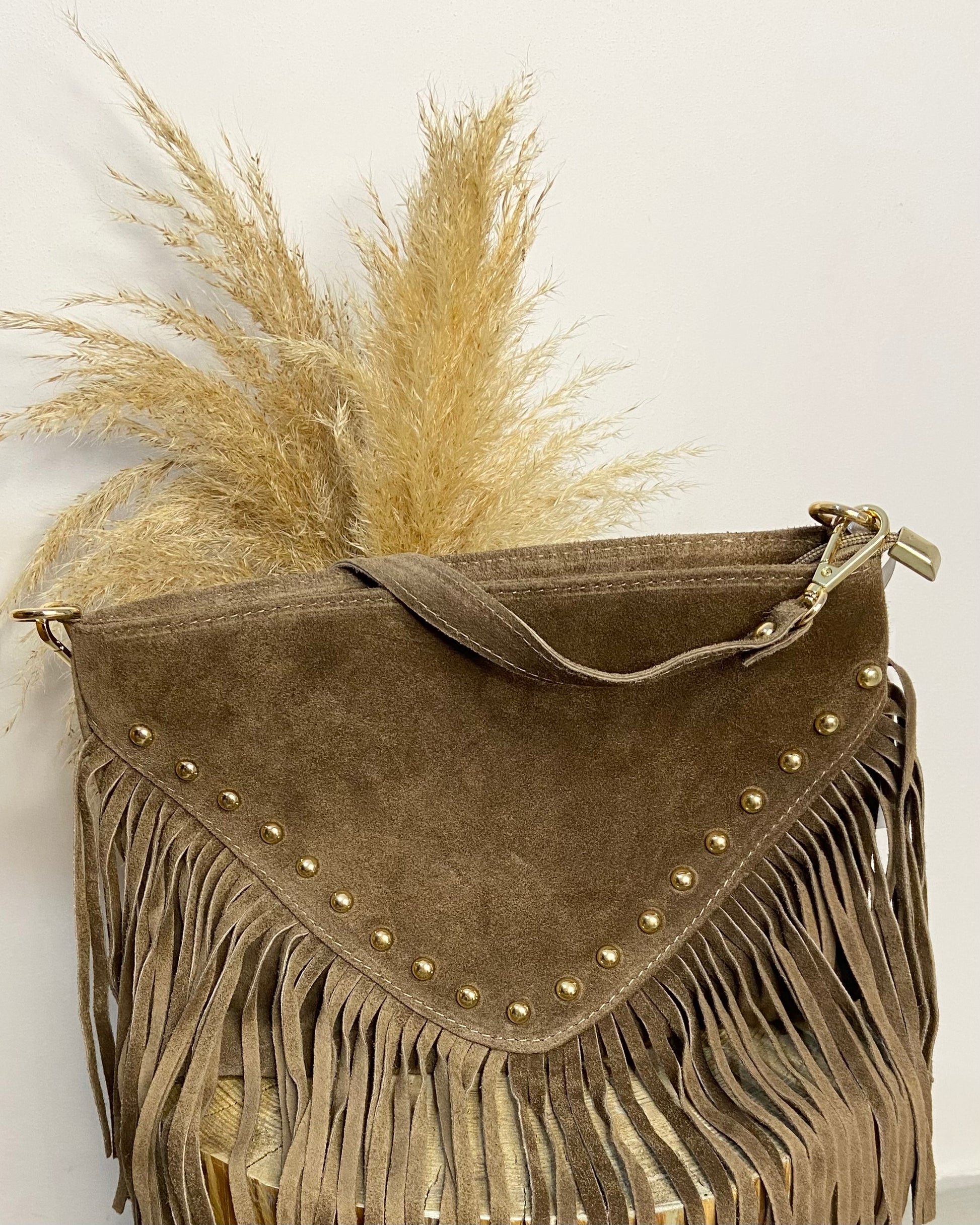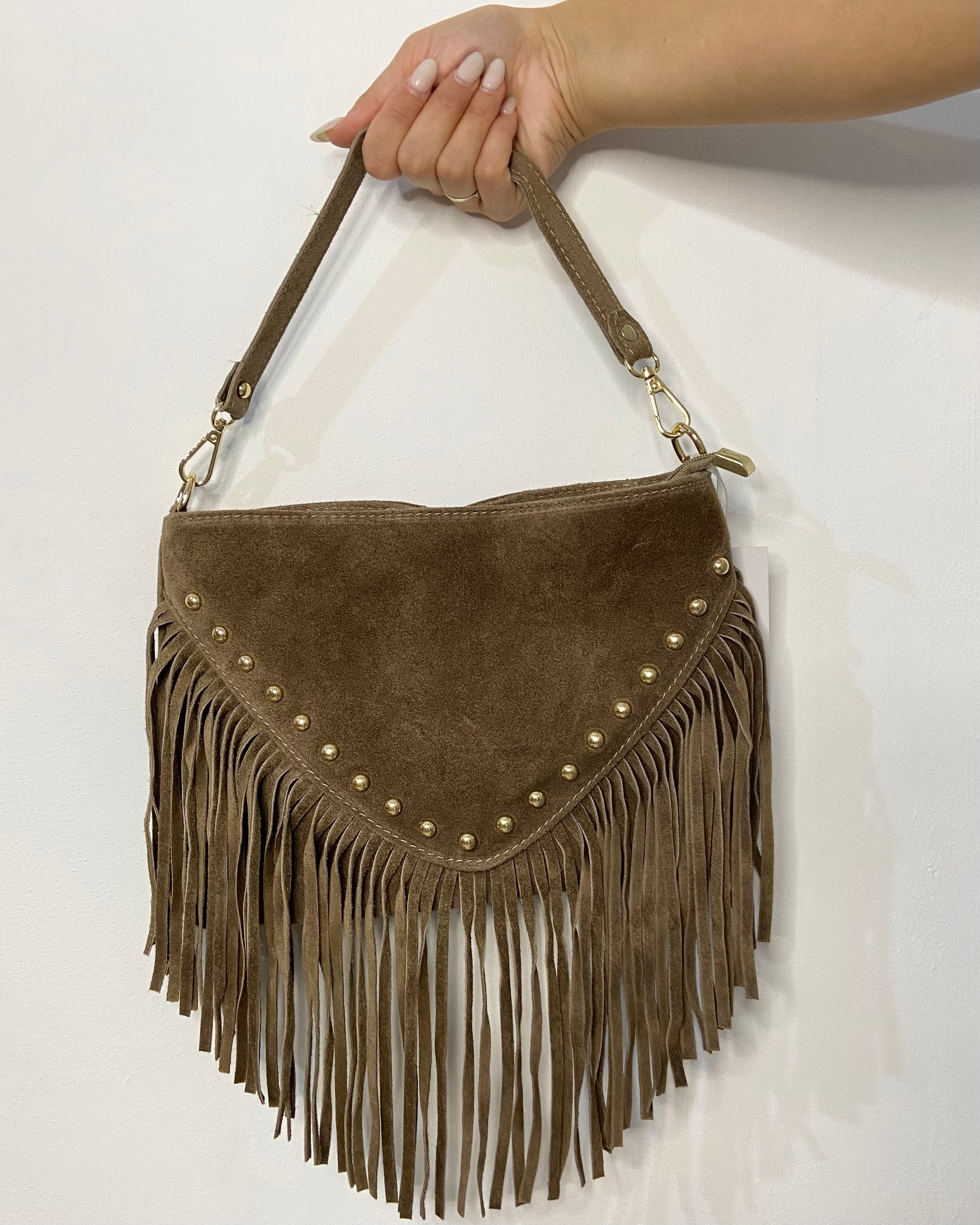 Borsetta in camoscio con applicazione di frange e tracolla all'interno.