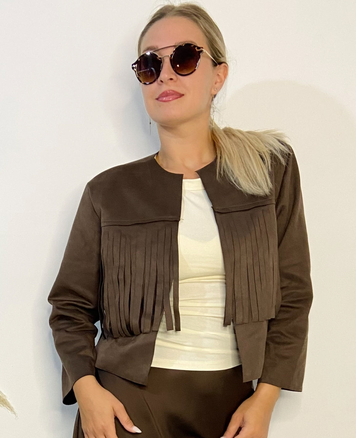 Giacca in suede senza abbottonatura con frange anteriori. Taglia unica vestibilitá da una taglia 38 ad una 44.