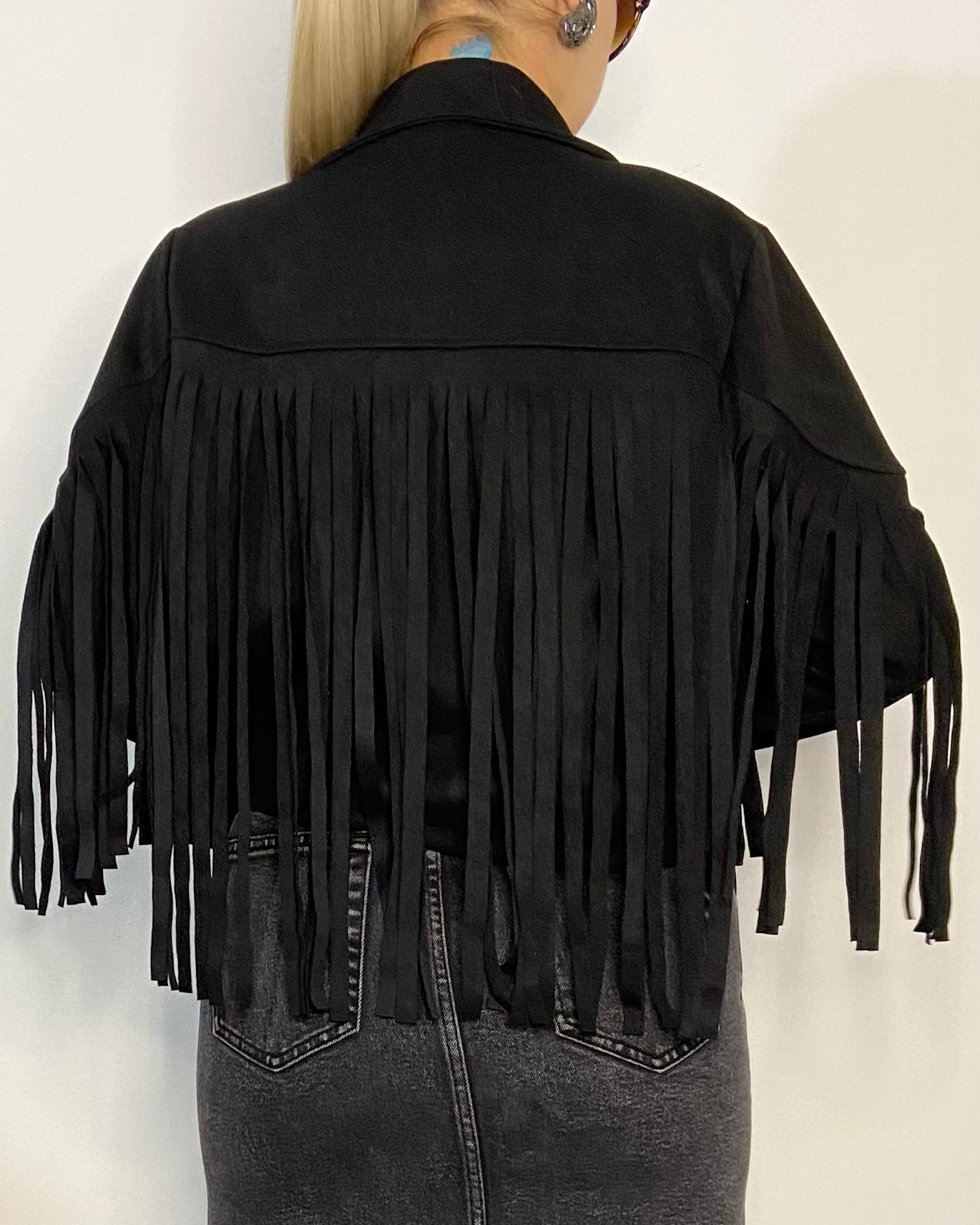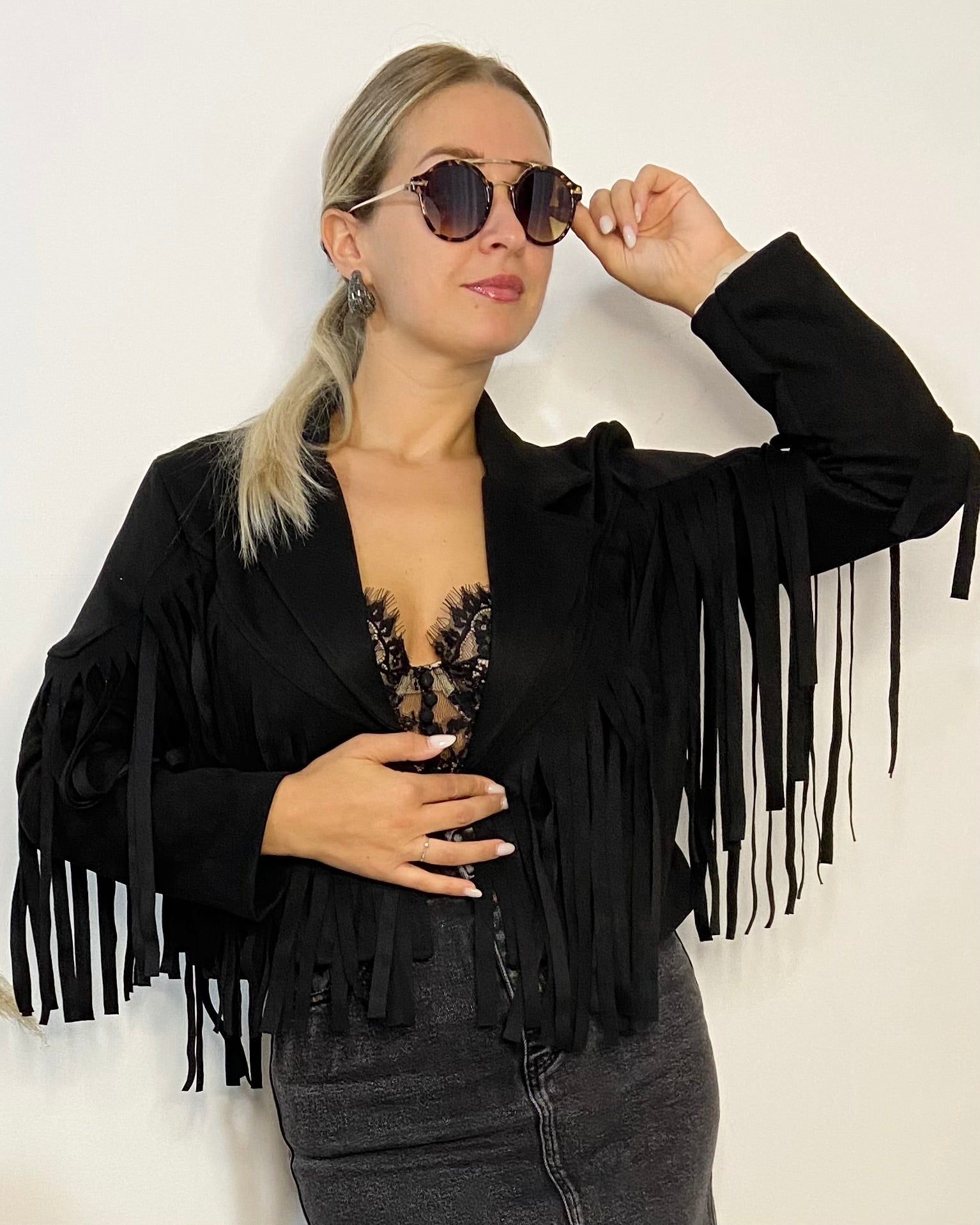 Giacca in tessuto suede con applicazione di frange anteriore, posteriore e maniche. Taglia unica, vestibilità da una taglia 38 ad una 44.