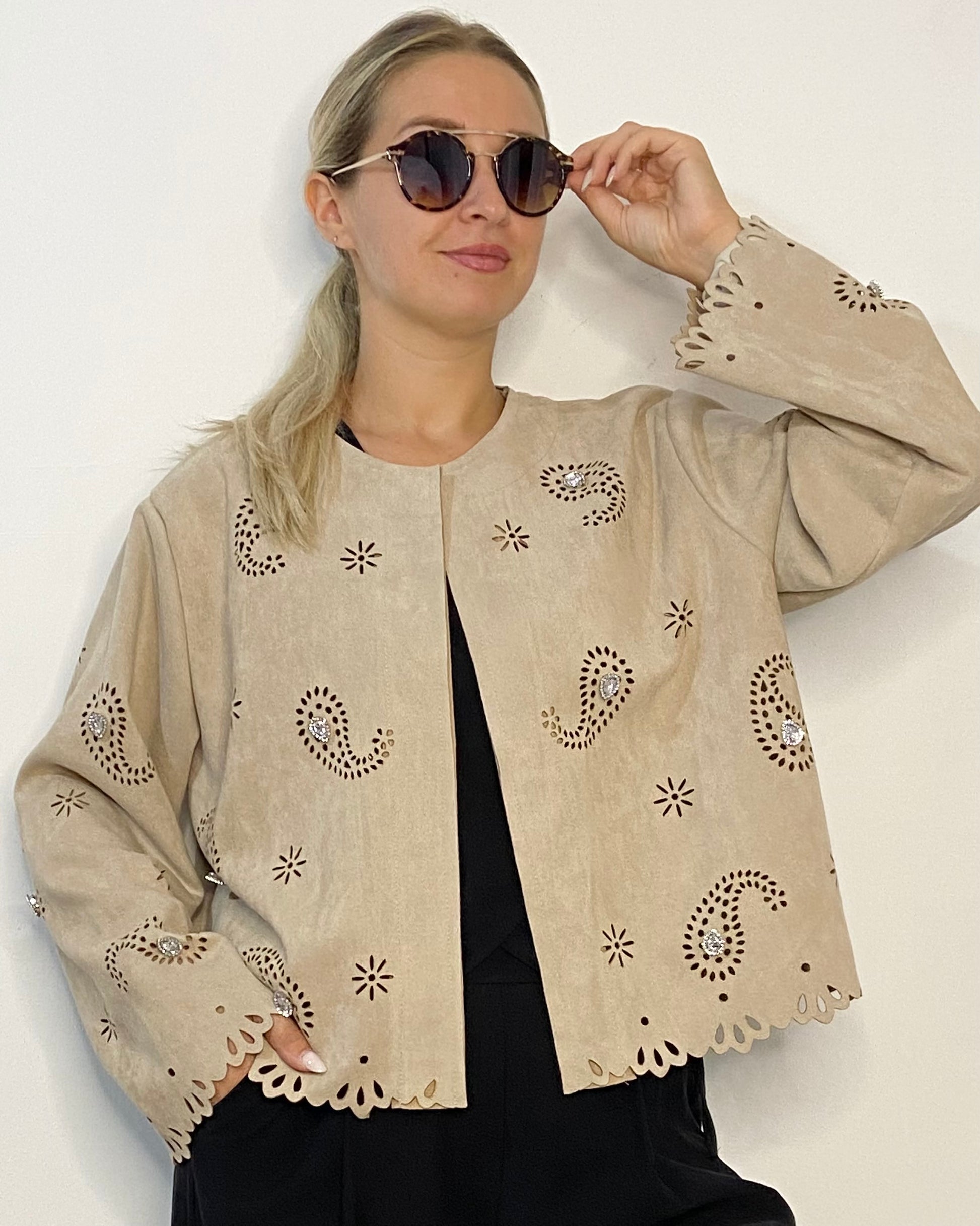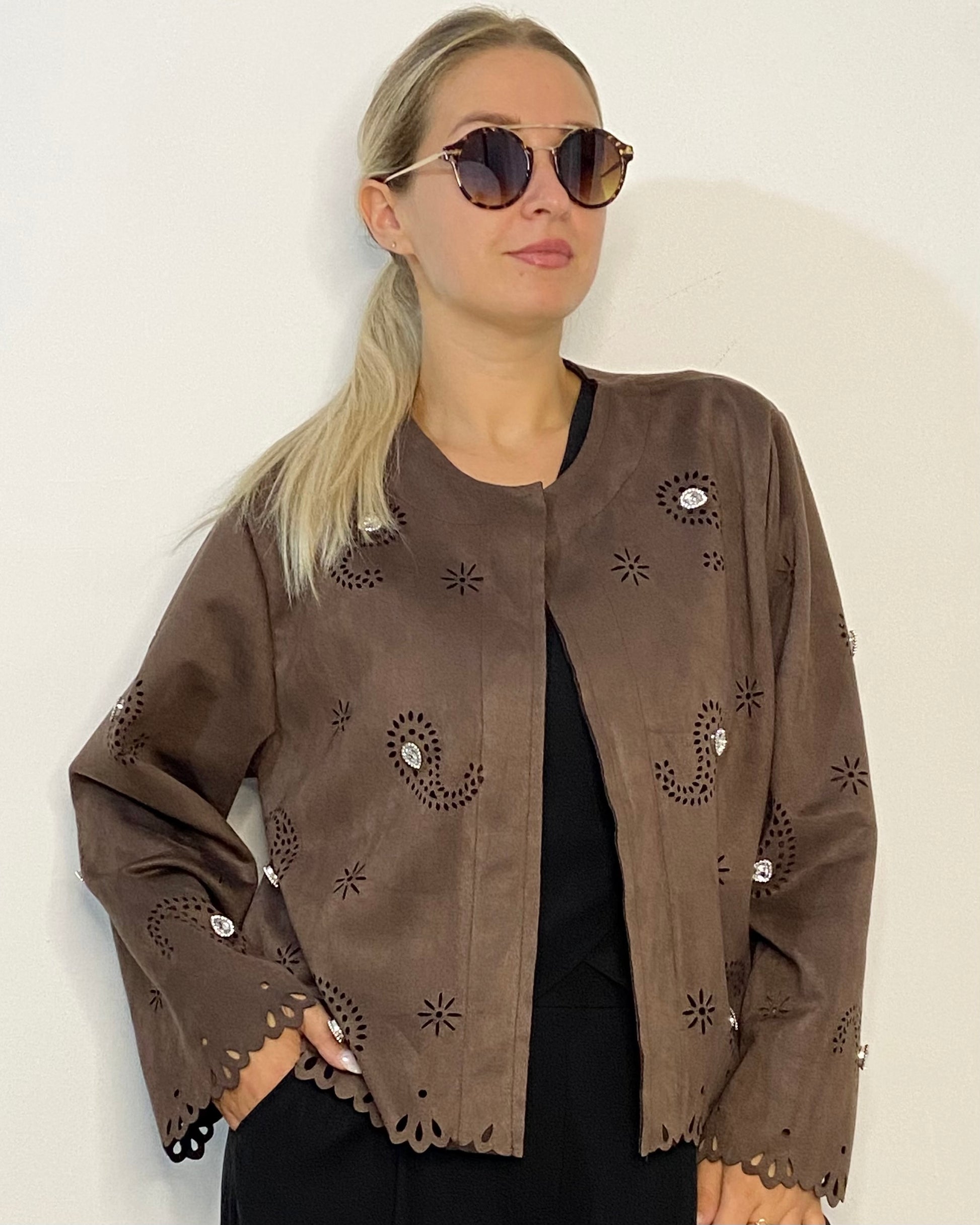 Giacca in tessuto suede traforato con applicazione di strass. Taglia unica, vestibilità da una taglia 42 ad una 46.