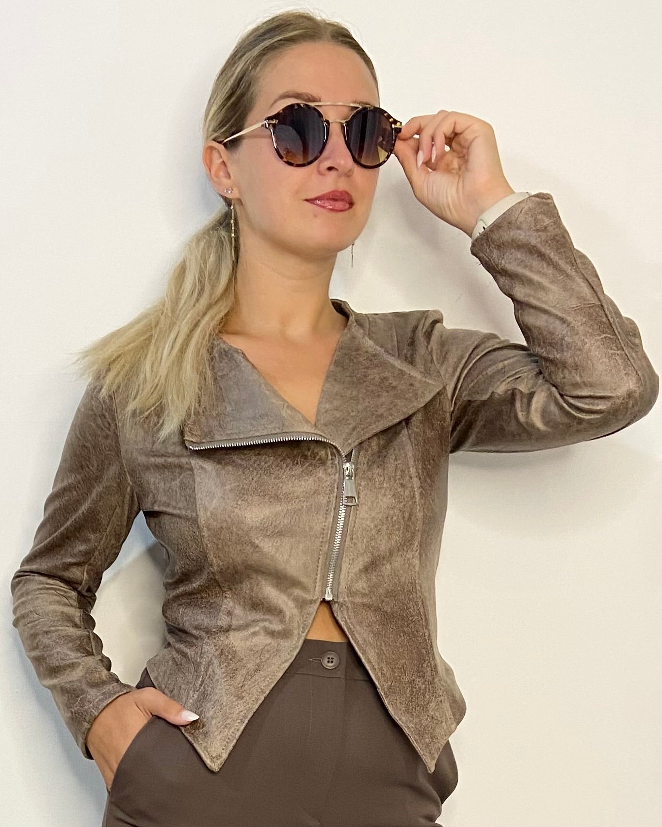 Giacca vestibilitá aderente e corta con cerniera laterale. Taglia S vestibilitá 38/40, la taglia M vestibilitá 40/42 e la taglia L vestibilitá 44.