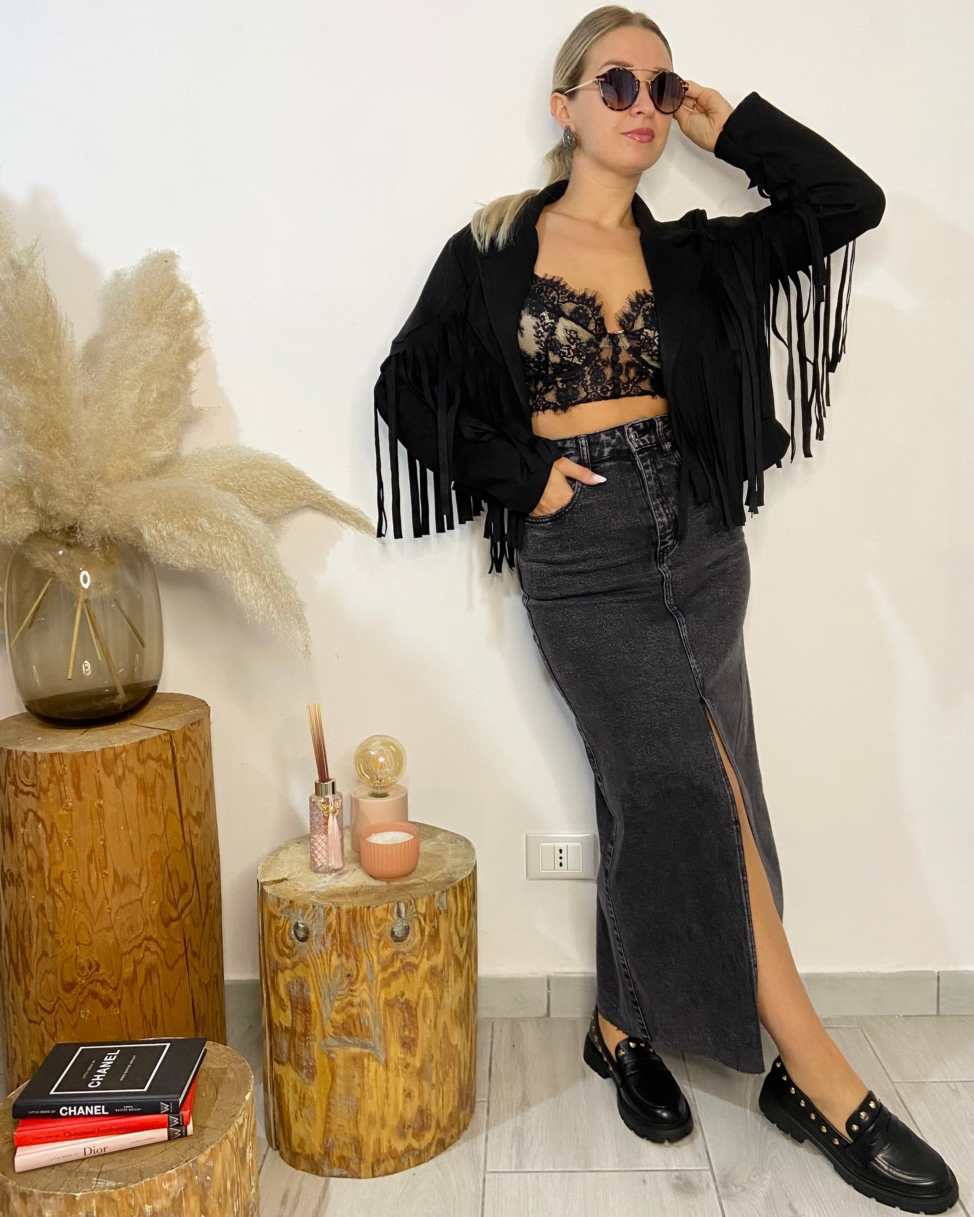 Gonna in tessuto jeans, vita alta con spacco anteriore. La taglia XS veste una taglia 38/40, la taglia S veste una 40/42, la taglia M veste una 42/44, la taglia L una 44/46.
