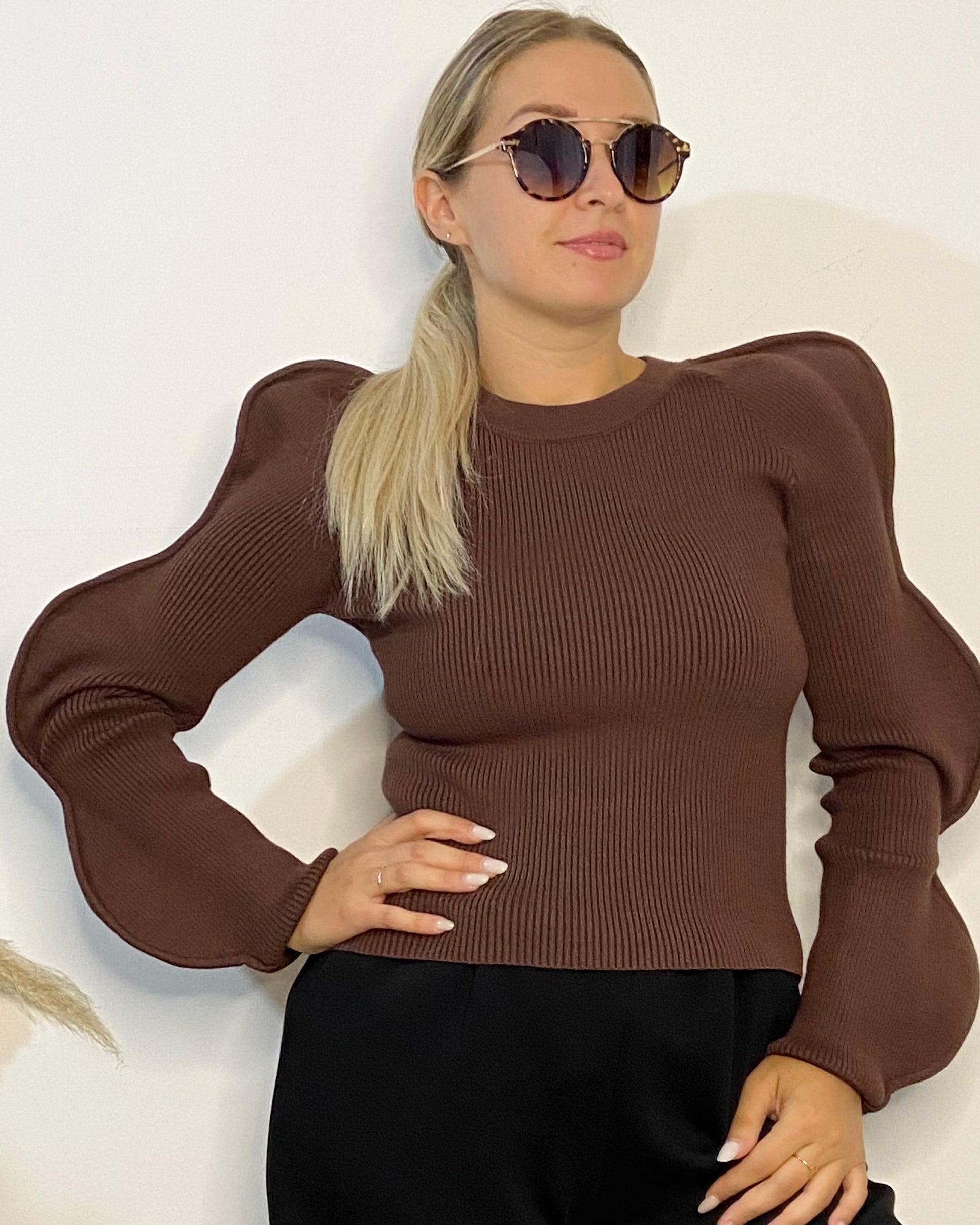 Maglia con tessuto a costine e manica ondulata. Taglia unica vestibilitá da una taglia 38 ad una 44.